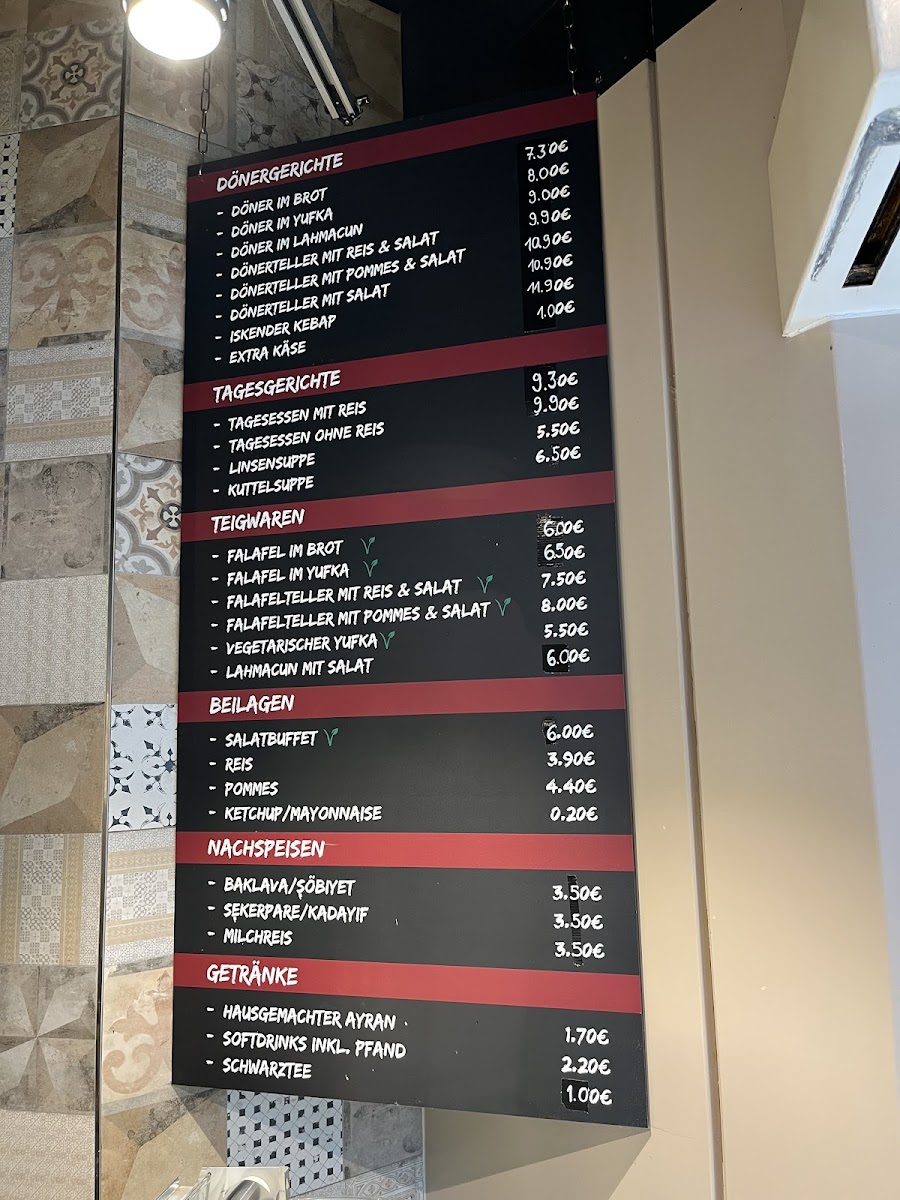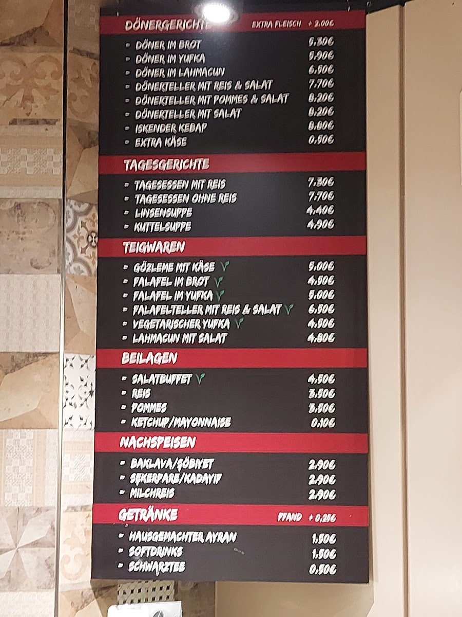 The menu boasts a delectable array of dishes. Indulge in Dönergerichte like the classic Döner im Brot for just €6.50 or elevate your meal with the rich Iskender Kebap at €10.90. Vegetarian options abound, featuring mouthwatering Falafel choices from €5.50. Complement your selection with a variety of side dishes, including fresh salads and crispy fries.